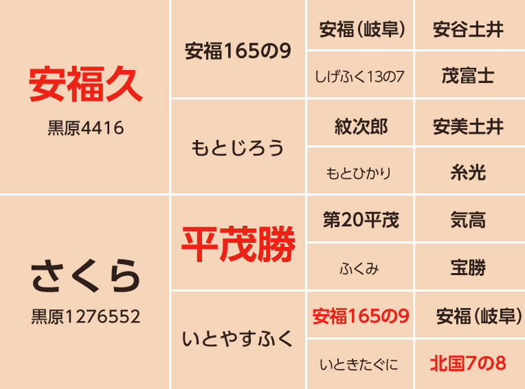 12 | 雌 | 安糸福 | 平茂勝 | H27.4.27 | 31.5 | 415.5 | 58 | 8.7 | 2.9 | 75.0 | 6 | A-4 |